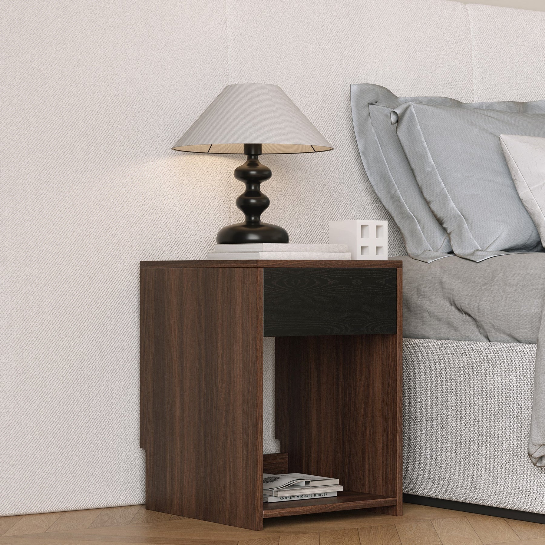 Concebida com linhas modernas e elegantes, esta mesa de apoio combina sofisticação com praticidade. A textura quente da madeira realça a atmosfera de qualquer espaço, enquanto a combinação de uma prateleira aberta e uma gaveta oculta garante fácil acesso e organização sem desordem. Quer colocada na sala, no quarto ou no escritório, integra-se perfeitamente na sua decoração, adicionando um toque de sofisticação e comodidade ao dia a dia.