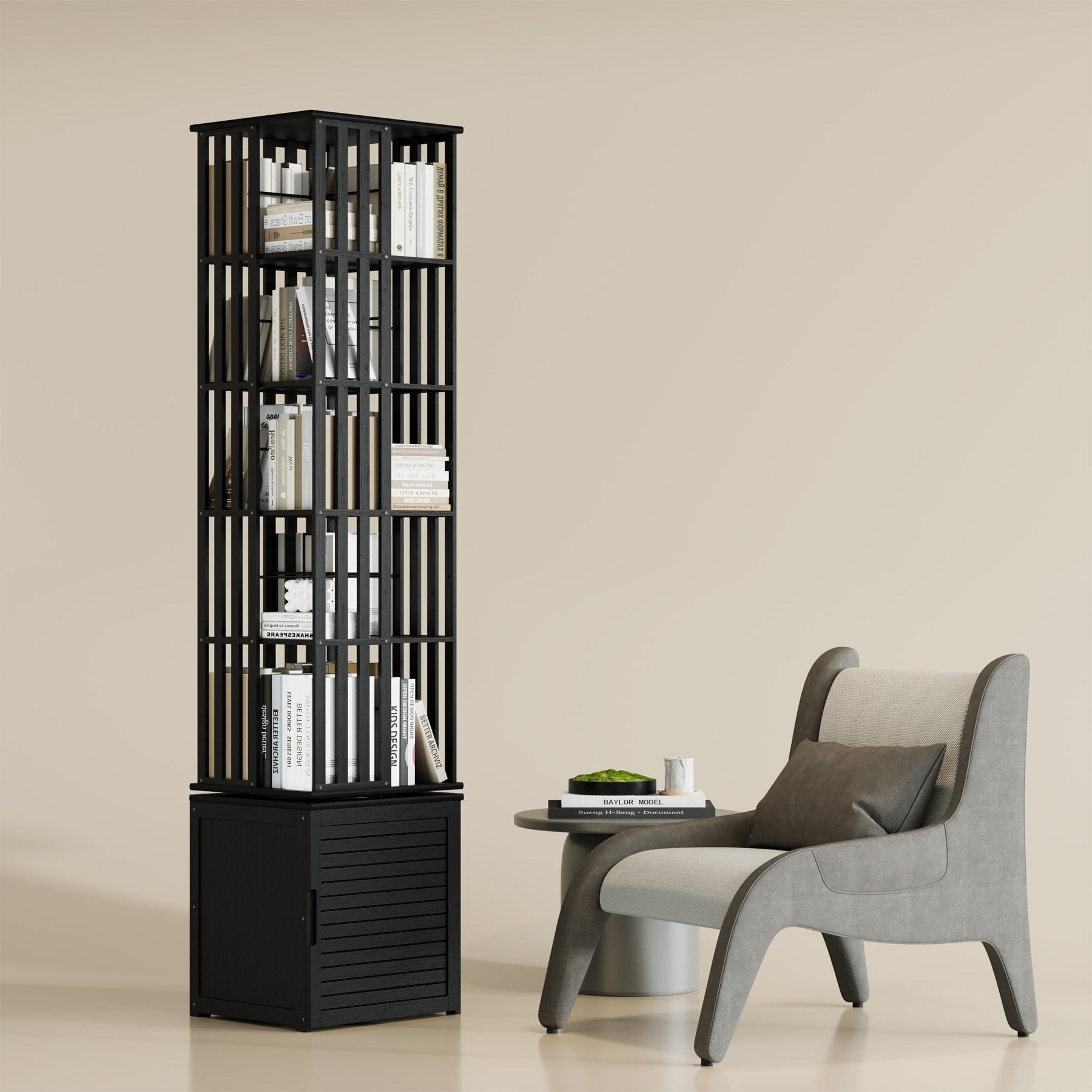 Esta estante com padrão vazado vertical oferece uma plataforma adicional para guardar os seus livros com estilo. A base giratória de 360° com rodas permite escolher e aceder ao seu livro preferido de forma prática e rápida. A versão Pro de 6 prateleiras oferece mais espaço de arrumação sem sacrificar o design compacto.